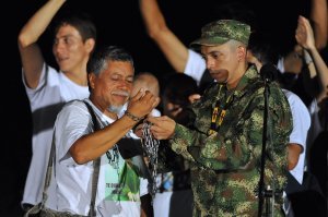 El sargento Moncayo liberado el pasado martes, quita las cadenas que portaba su padre como símbolo de su cautiverio por las FARC
