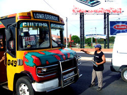 | Nelson pregunta al conductor del autobús si quiere que le limpie el parabrisas. Le acepta. (Foto: Efrain) |
