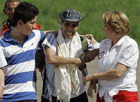 | El ex rehen Alan Jara, centro, camina con su hijo Alan Felipe, izquierda, y su esposa Claudia Rugeles |
