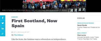 En Bloomberg View, espacio de Bloomberg News dedicado a los editorialistas de la agencia, dirigido por David Shipley, exeditor de las páginas de opinión de The New York Times, escriben que "al igual que los escoceses, los catalanes quieren un referéndum sobre la independencia. A diferencia de los británicos, los españoles no están dispuestos a dejar que lo tengan. Esto es un error y los líderes de España tienen que mostrar un poco de inusitada habilidad política y hacer posible la votación, incluso haciendo campaña para la unión".