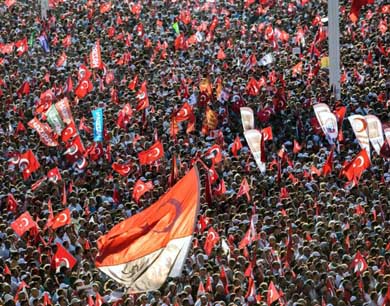 La concentración multitudinaria en la icónica plaza tiene lugar bajo estrictas medidas de seguridad. Fue convocada por el principal partido de la oposición, el Partido Republicano del Pueblo (CPH, laico y de centroizquierda).
