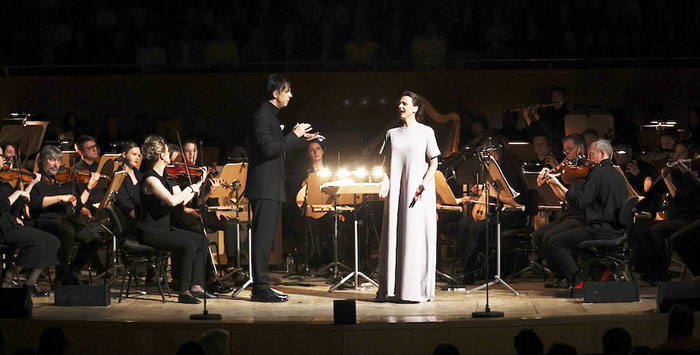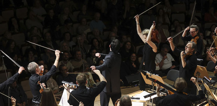 Las sopranos, que se habían acercado al director desde distintos lugares envueltas en largas túnicas con paso lento, entonaban suaves y melodiosas arias casi al oído de Currentzis que dirigía a la vez a cada una de ellas, casi bailando juntos, y a la prodigiosa orquesta que parecía sentirse cómplice con el director al que conoce muy bien desde hace más de 20 años. Una orquesta que se caracteriza por traspasar constantemente los límites de sus posibilidades creativas en el campo de la música antigua en interpretaciones históricamente informadas, clásicos académicos y música contemporánea, cuando hace falta. Una orquesta capaz de mostrar un sonido personal que la define. Y de utilizar con protagonismo instrumentos antiguos como la lira, el arpa, el aulós, una flauta doble, los krotala o castañuelas, los kymbala o címbalos, el sistro y diversos tipos de tambores. Como valor añadido la estupenda y estilosa concertino que se lució en solitario con su violín.