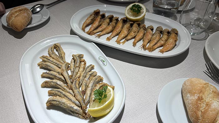 La carta es una sinfonía de antojos marinos que comienza con sus ya famosas frituras en aceite de oliva. Destacan los sensacionales salmonetes de Motril, las riquísimas puntillitas de Isla Cristina o los pequeñitos y sabrosos boquerones victorianos. Una fantástica forma de abrir el apetito antes de pasar a probar la impresionante selección de pescados y mariscos que varían en función de la temporada: desde la delicada Gamba Blanca de Huelva y las cañaillas de Isla Cristina, hasta los langostinos de Trasmallo.