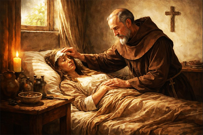 Aunque algunos dudaban de que pudiera hacer algo, los criados fueron enviados con urgencia al monasterio franciscano, regresando poco después con el fraile. A su llegada, encontró a la señora exhausta y al borde del desfallecimiento.