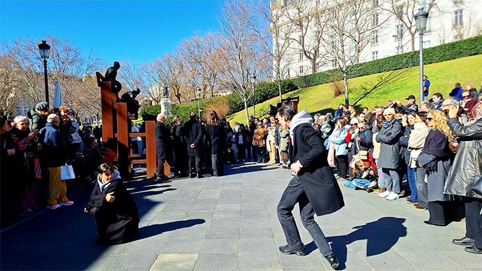 23FEB26 – MADRID.- Son las 13 horas de un soleado, y ventoso día de febrero cuando el equipo artístico con la dirección de Eduardo Rivero; la coreografía coral e interpretación de :Manuel Rodríguez, Marina de Remedios (bailarina y creadora de danza española)y Manuel Egozkue (artista multidisciplinar); la dirección coral de Isaac Diego; la coral Ensamble Vocal Ars Vocem: Pilar Dieste (mezzosoprano),Pablo Sainz de Robles (contra tenor),Guillermo Montero (tenor), Amaro González de Mesa (tenor) Cheluis Padrino(tenor),Victor Galván(bajo) ,y Fernando Villarreal (bajo)., Isaac Diego (director,alto bajo); y Guión:Lionel Braverman.