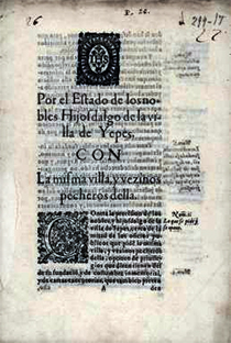 “Por el Estado de los nobles Hijosdalgo de la villa de Yepes. Con la misma villa, y vezinos pecheros della. Contra la pretẽsion de los nobles, y hijosdalgo de la villa de Yepes, cerca de la mitad de los oficios publicos que pidẽ la misma villa, y vezinos pecheros della, oponen de priuilegios que dizen tienen desde su fundaciõ, y de costumbre inmemorial ...