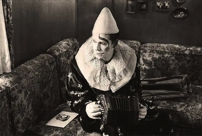 Iba vestido de payaso clásico, con la cara pintada de blanco y las mejillas de colorado.