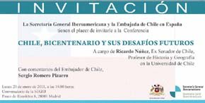 En esta ocasión, los diferentes colectivos y asociaciones de chilenos en España han elegido una conferencia que tendrá lugar el día 24 de enero en la Secretaria General Iberoamericana (SEGIB) en el céntrico Paseo de Recoletos Nº 8 de Madrid, a las 19.00 hrs. En dicha ocasión, el embajador Romero participará como comentarista en la conferencia “Chile, Bicentenario y sus Desafíos Futuros” que pronunciará Ricardo Núñez, Ex Senador de Chile, Profesor de Historia y Geografía en la Universidad de Chile.